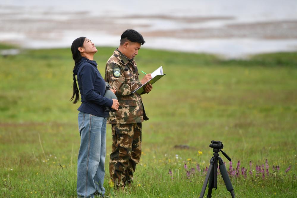 甘肅尕海則岔國家級自然保護(hù)區(qū)管護(hù)中心尕海保護(hù)站站長香毛吉(左)和同事在巡護(hù)過程中做記錄。 新華社記者 方欣 攝