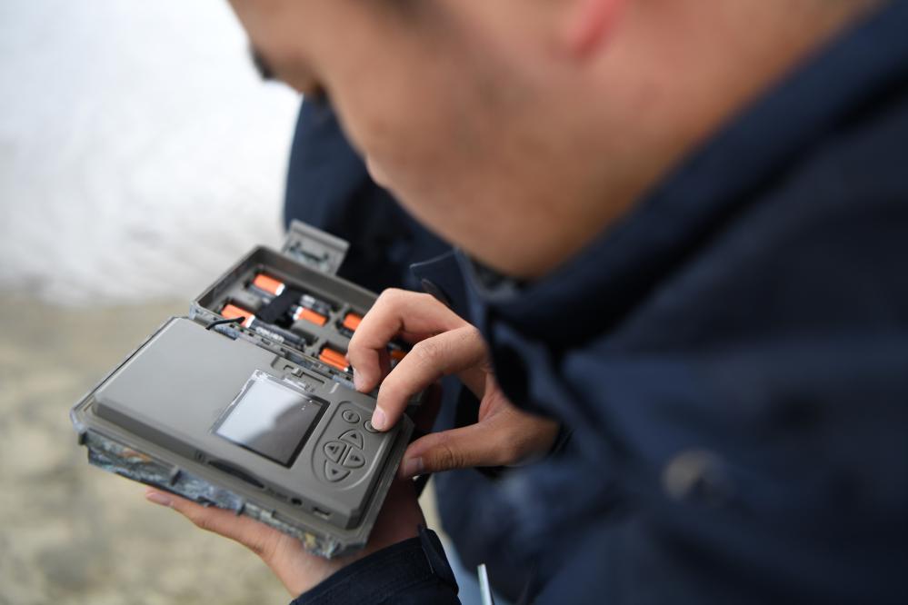 甘肅黃河首曲國家級自然保護(hù)區(qū)管護(hù)中心曼日瑪保護(hù)站的工作人員在保護(hù)區(qū)內(nèi)檢查紅外相機(jī)的工作情況。 新華社記者 方欣 攝