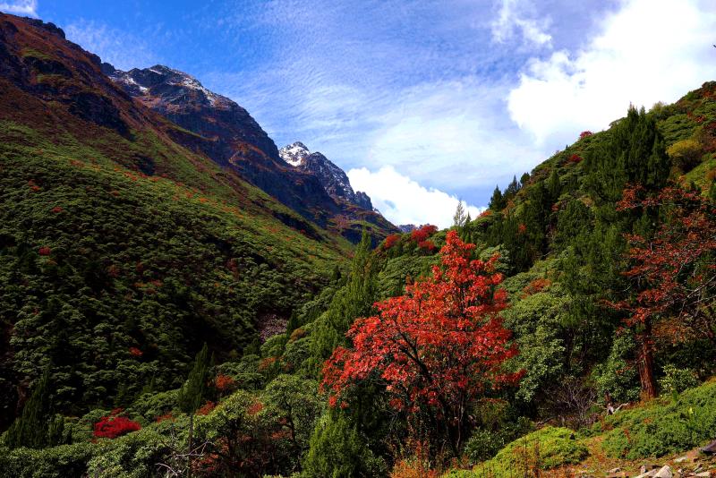 火紅的樹葉如同一叢叢盛開的鮮花點綴在綠樹間