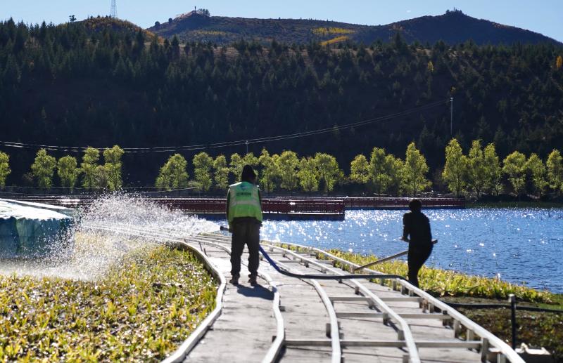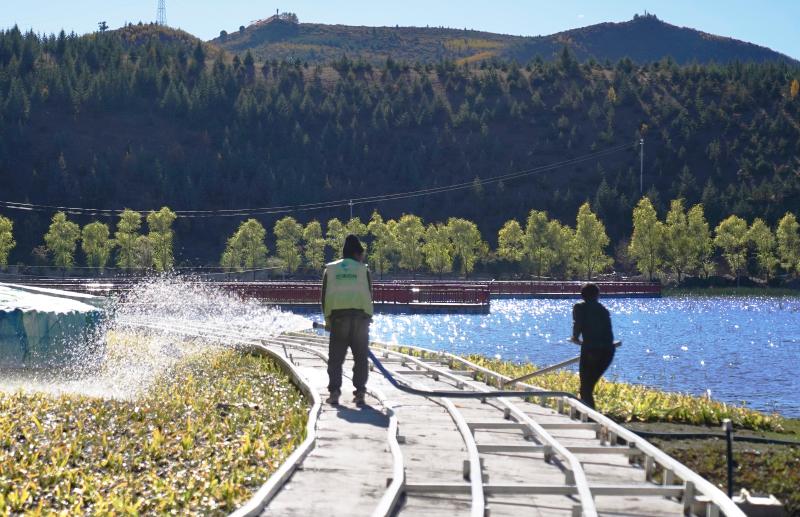 圖為工人在拉姆央措湖畔鋪設(shè)環(huán)湖步行棧道、鋪貼路面石板。目前,拉姆央措湖保護治理與生態(tài)修復基礎(chǔ)設(shè)施建設(shè)工程已完成總工程量的95%,正加緊推進路面石板鋪貼、木棧道安裝、吸煙亭改造等掃尾工作。拉姆央措湖水清景美煥新顏。