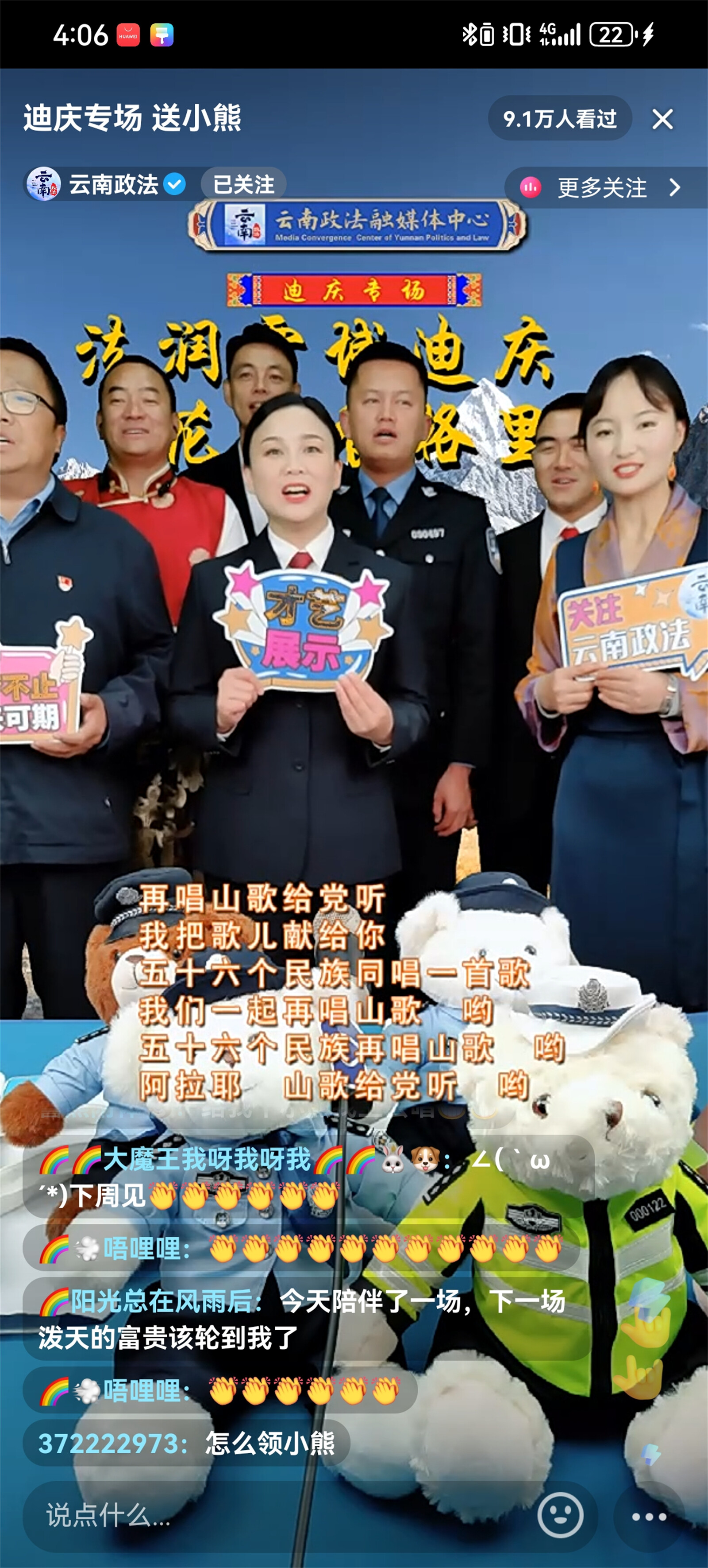 近日,迪慶州政法干警走進(jìn)云南政法普法強(qiáng)基直播間開展“法潤雪域迪慶、花開香格里拉”迪慶州普法專場直播,直播聚焦群眾關(guān)切,緊密聯(lián)系時(shí)事熱點(diǎn),帶廣大網(wǎng)友體驗(yàn)了一場內(nèi)容豐富的普法之旅,共吸引9.1萬人觀看,獲點(diǎn)贊超10.4萬。