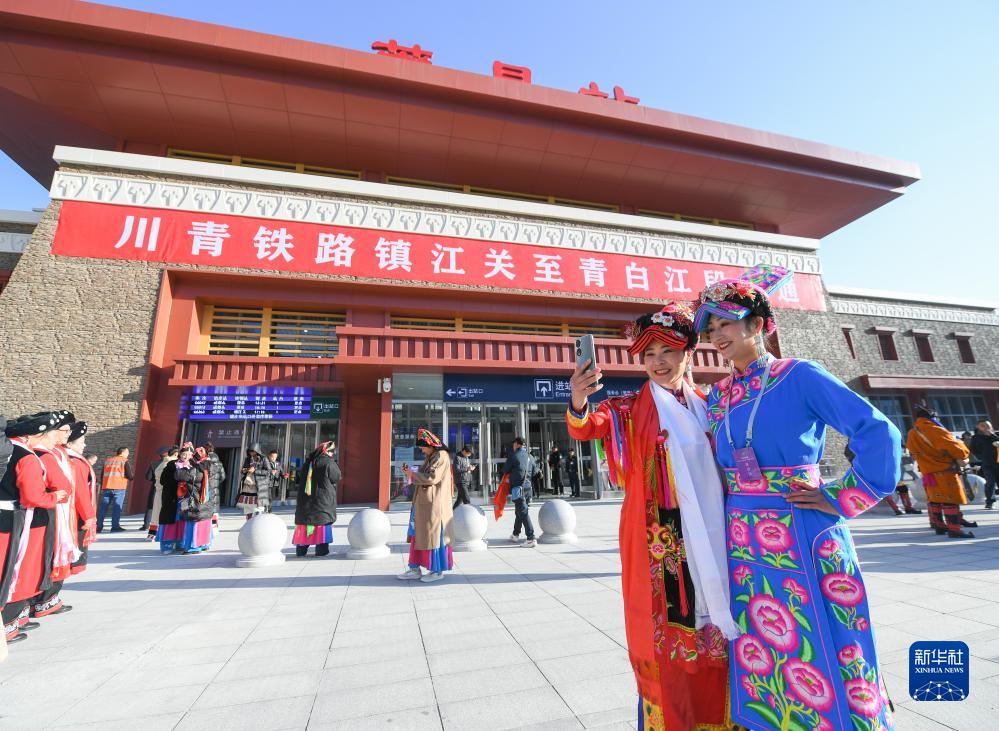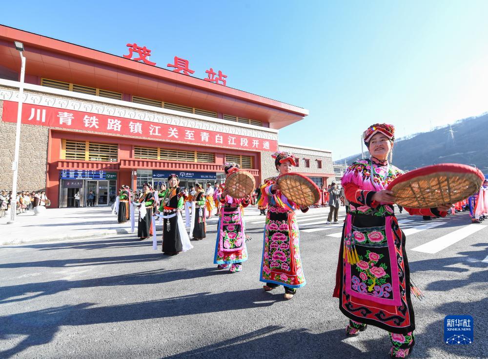 11月28日,在川青鐵路茂縣站,當(dāng)?shù)馗髯迦罕娫谡厩皬V場慶祝鐵路開通運營。新華社記者 王曦 攝