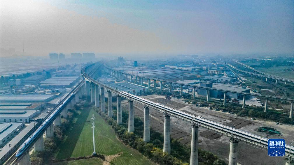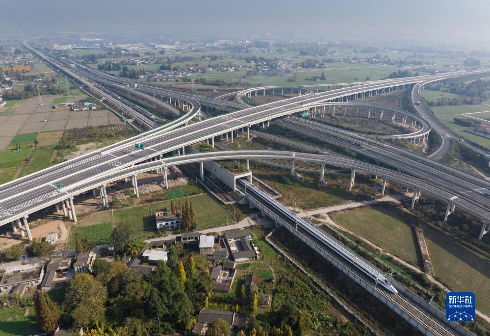 11月28日,首發(fā)列車C6008次列車行駛在川青鐵路上,該段與成萬高速并行、與成都都市圈環(huán)線高速交會(無人機照片)。新華社記者 江宏景 攝