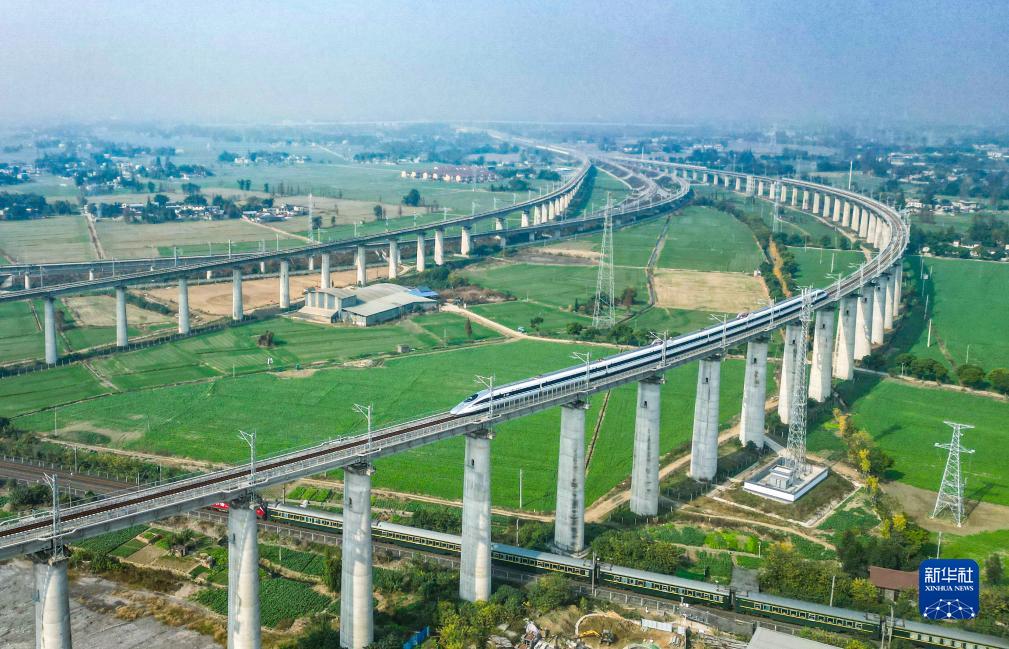 11月28日,在成都市青白江區(qū)境內(nèi)拍攝的行駛在川青鐵路上的列車(上)和行駛在西成高鐵線上的列車(下)(無人機照片)。新華社記者 王曦 攝