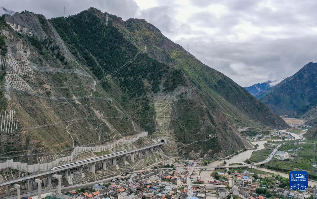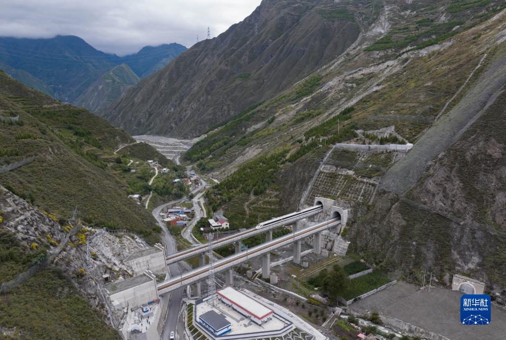調(diào)試列車駛出川青鐵路榴桐寨隧道(11月13日攝,無人機照片)。新華社記者 江宏景 攝