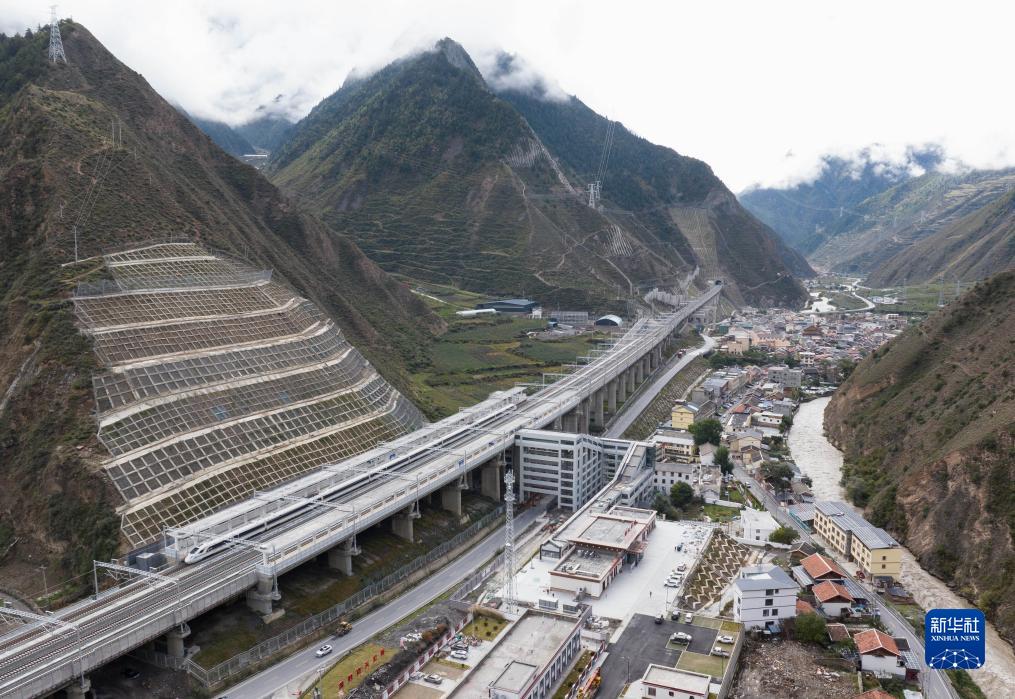 調(diào)試列車駛?cè)氪ㄇ噼F路茂縣站(10月13日攝,無人機照片)。新華社記者 王曦 攝