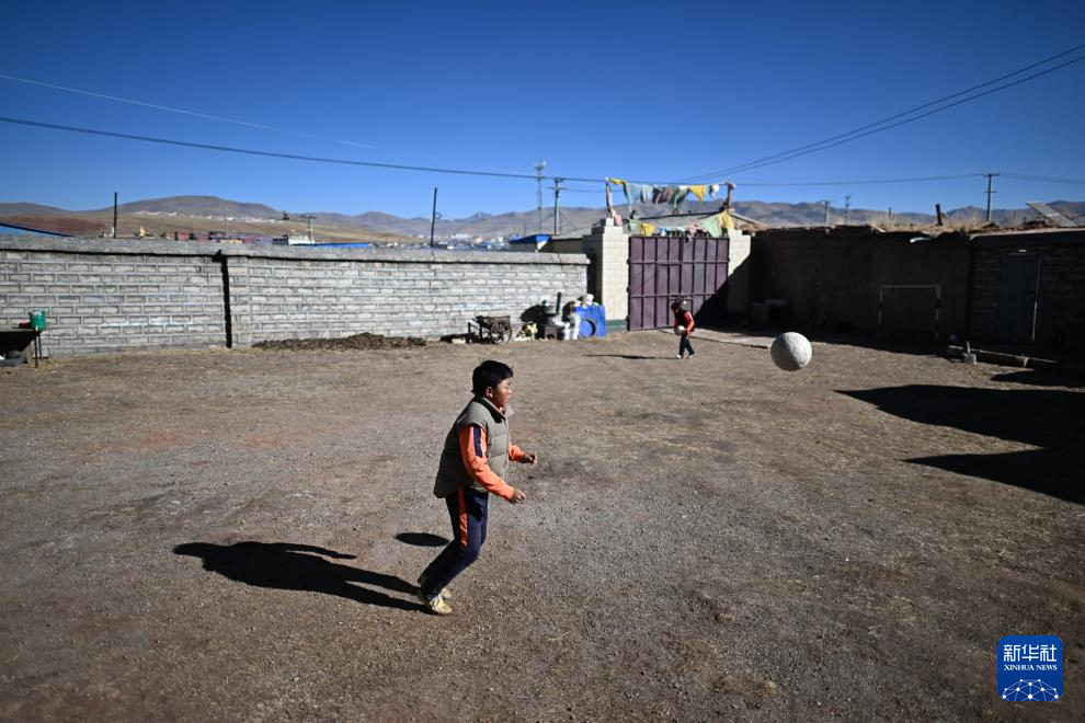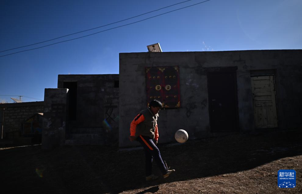 青海玉樹曲麻萊縣約改鎮(zhèn)中心寄宿制學(xué)校學(xué)生悟金唐巧多杰在家中踢球,作為曲麻萊青訓(xùn)隊一員,他即將前往廣西壯族自治區(qū)北海市參加球隊冬訓(xùn)(1月12日攝)。新華社記者 韓方方 攝