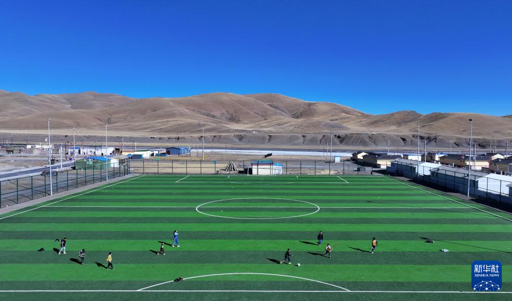 1月12日,孩子們在青海玉樹曲麻萊縣葉格鄉(xiāng)足球場上踢球(無人機照片)。新華社記者 韓方方 攝