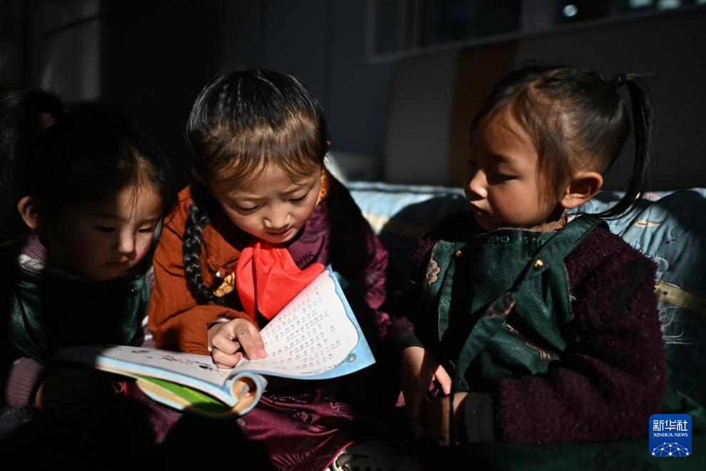 青海玉樹曲麻萊縣第二民族完全小學(xué)學(xué)生達沙旦增德金(中)在家中給妹妹講故事(1月12日攝)。新華社記者 張宏祥 攝