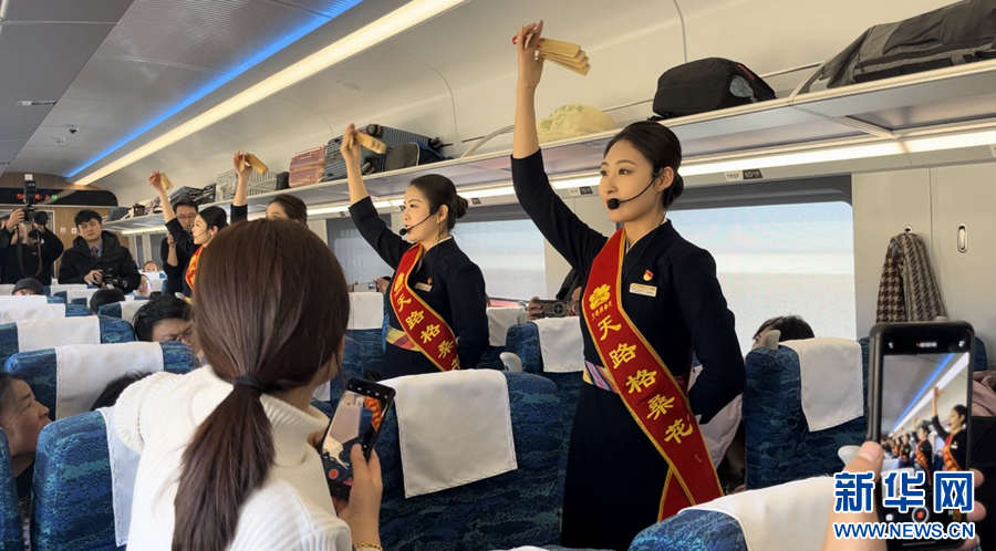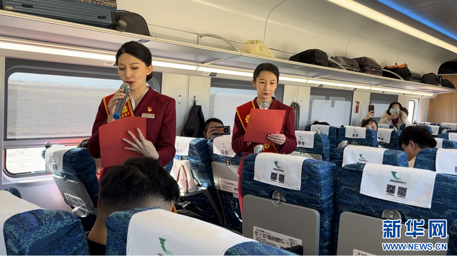 車廂內(nèi),喜慶的燈籠高高掛起,紅色的對聯(lián)、剪紙點(diǎn)綴其間,濃厚的新年氛圍撲面而來。過道里,乘務(wù)員們的律動操、音樂快板、詩朗誦等精彩節(jié)目令人目不暇接,乘客們紛紛拿起手機(jī)拍照錄像記錄。
