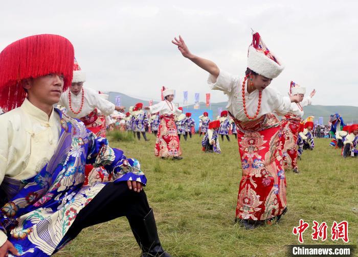 2020年8月22日,甘肅甘南藏族自治州夏河縣藏族民眾,身著色彩斑斕的節(jié)日盛裝,載歌載舞。(資料圖)高展 攝