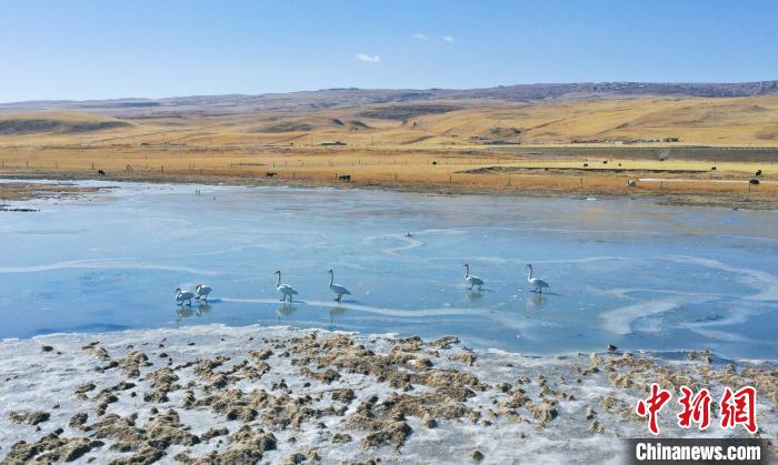 航拍青海湖泉灣濕地內(nèi)的大天鵝。馬銘言 攝