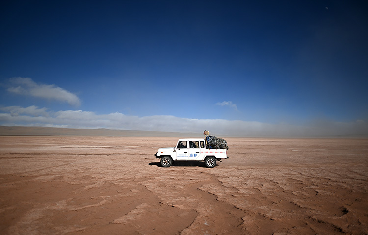 車輛越是深入無人區(qū),空氣中氧氣含量越稀薄,道路越難走。在顛簸近七個小時后,記者和巡山隊員到達了可可西里中心地帶、重點巡護區(qū)域——卓乃湖。