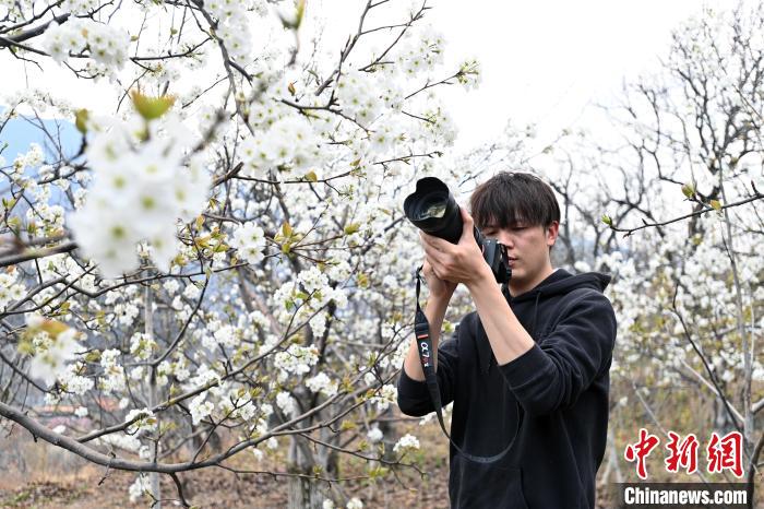 藏族姑娘在梨花林里拍照。記者 安源 攝