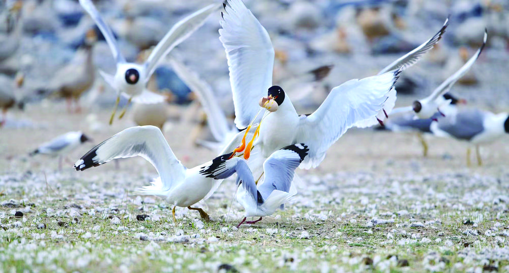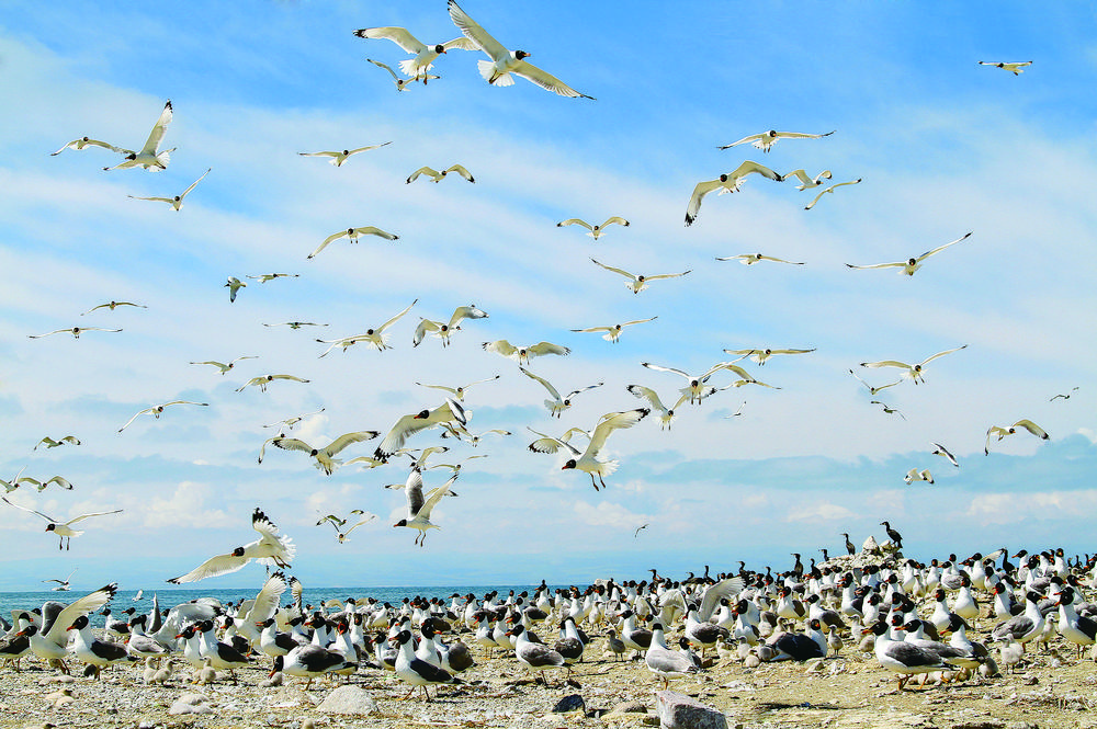 候鳥北歸,青海湖又將進入一年中最美麗的時節(jié)。浮想盛夏時節(jié),棕頭鷗、漁鷗、斑頭雁、普通鸕鶿等水鳥,或成群在低空中擺著“隊形”,或“拖家?guī)Э凇痹谒嫔湘覒蛲嫠?,或和洄游的湟魚上演魚鷗“大戰(zhàn)”,碧波蕩漾的青海湖將美得如詩如畫。(本版圖片除署名外,其他均由青海湖景區(qū)保護利用管理局提供)