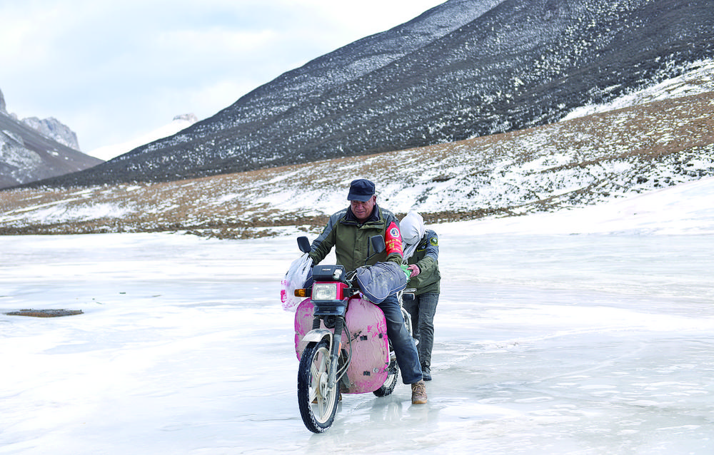 每天巡護(hù),要沿著冰面行走時(shí),葉抓西才郎推著摩托車,宋成芳在后面扶著,即便這樣,還會(huì)摔倒,“遇上一些小坡,只能將摩托車放倒,拴上一根繩子,慢慢滑下去,到了上坡,還是要把摩托車放倒,慢慢拉上去?!?/p>