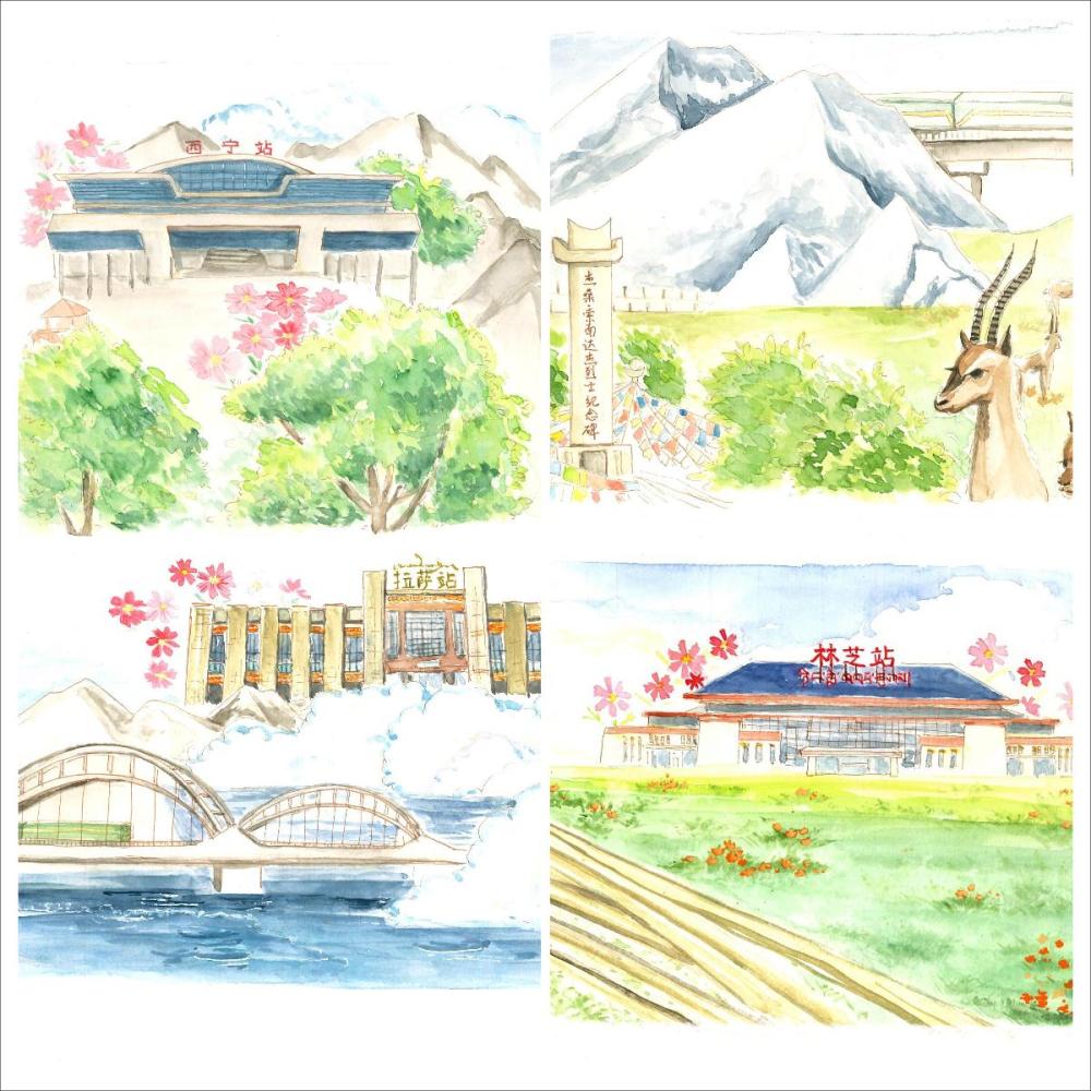 2023年,一組“魅力青藏、幸福天路”的水彩畫(huà)讓周源“火出圈”,從西寧站到林芝站,從丹噶爾古城到林芝的桃花林,長(zhǎng)長(zhǎng)的鐵軌將沿線的景觀特色串聯(lián)起來(lái),構(gòu)成一幅美輪美奐的天路長(zhǎng)圖。