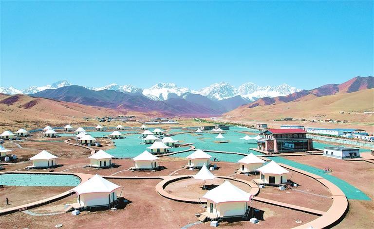 藍(lán)天白云、雪山皚皚,俯瞰天祝縣抓喜秀龍旅游基礎(chǔ)設(shè)施建設(shè)項(xiàng)目現(xiàn)場(chǎng),蜿蜒曲折的木棧道如花莖延伸,一座座白頂帳篷外形的民宿似雪蓮綻放,幾十名工人爭(zhēng)分奪秒搶抓工期,為項(xiàng)目完工做最后沖刺。