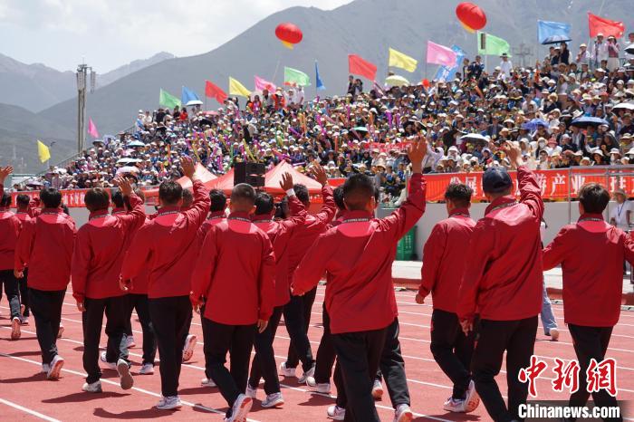 圖為海北祁連山藏羊隊(duì)隊(duì)員入場(chǎng)和觀眾揮手致意。馬銘言 攝