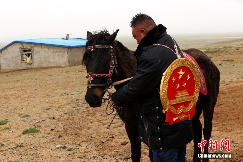 6月3日,在青海省果洛藏族自治州瑪多縣花石峽鎮(zhèn),瑪多縣人民法院“馬背法庭”的法官在安撫馬匹。薛蒂 攝