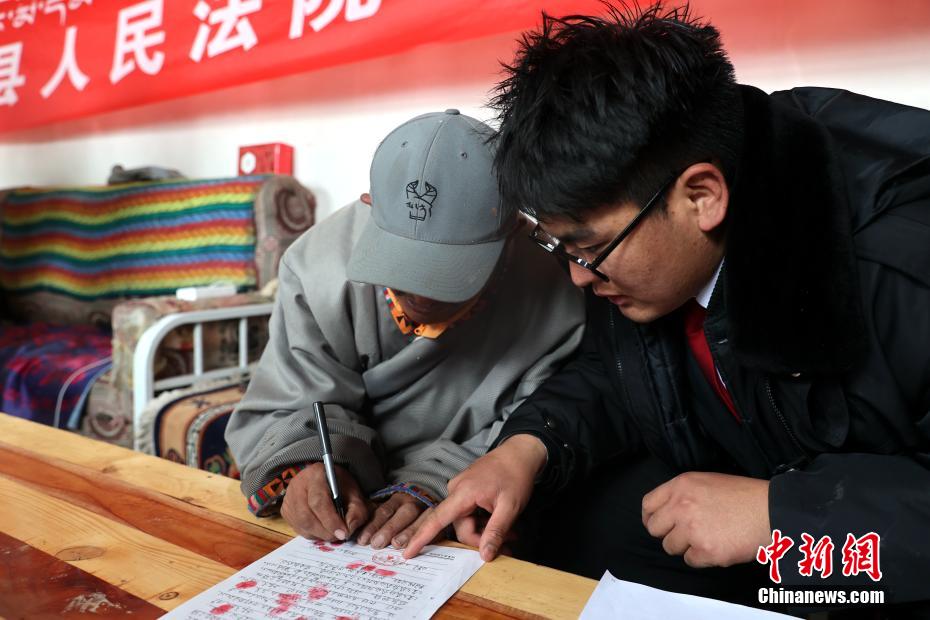 6月3日,在青海省果洛藏族自治州瑪多縣花石峽鎮(zhèn),瑪多縣人民法院“馬背法庭”的法官在牧民家中完成調(diào)解并簽字確認。薛蒂 攝