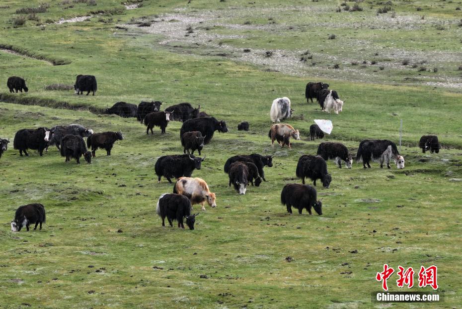 6月4日,航拍青海省海北藏族自治州剛察縣草原上,成群牦牛正在覓食。(無人機照片)馬銘言 攝