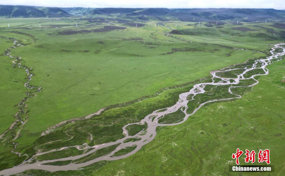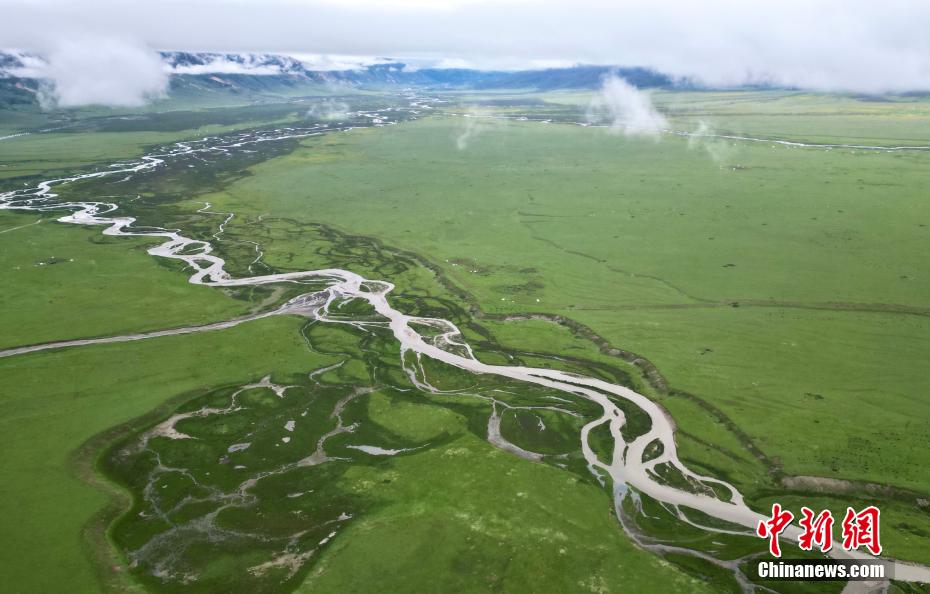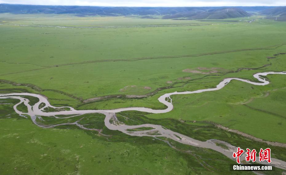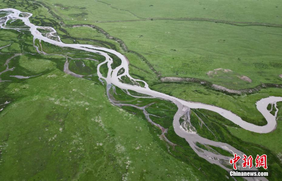 圖為6月26日,無量河蜿蜒在毛埡草原上。(無人機照片)中新社記者 王磊 攝