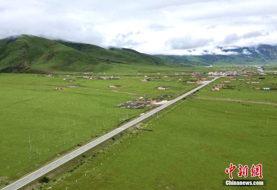 圖為6月26日,國道318線在毛埡草原上延伸。(無人機照片)中新社記者 王磊 攝