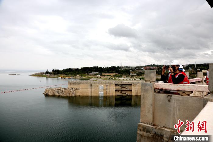 圖為網(wǎng)絡(luò)名人及媒體記者眺望龍羊峽水電站大壩。中新社記者 張?zhí)砀?攝