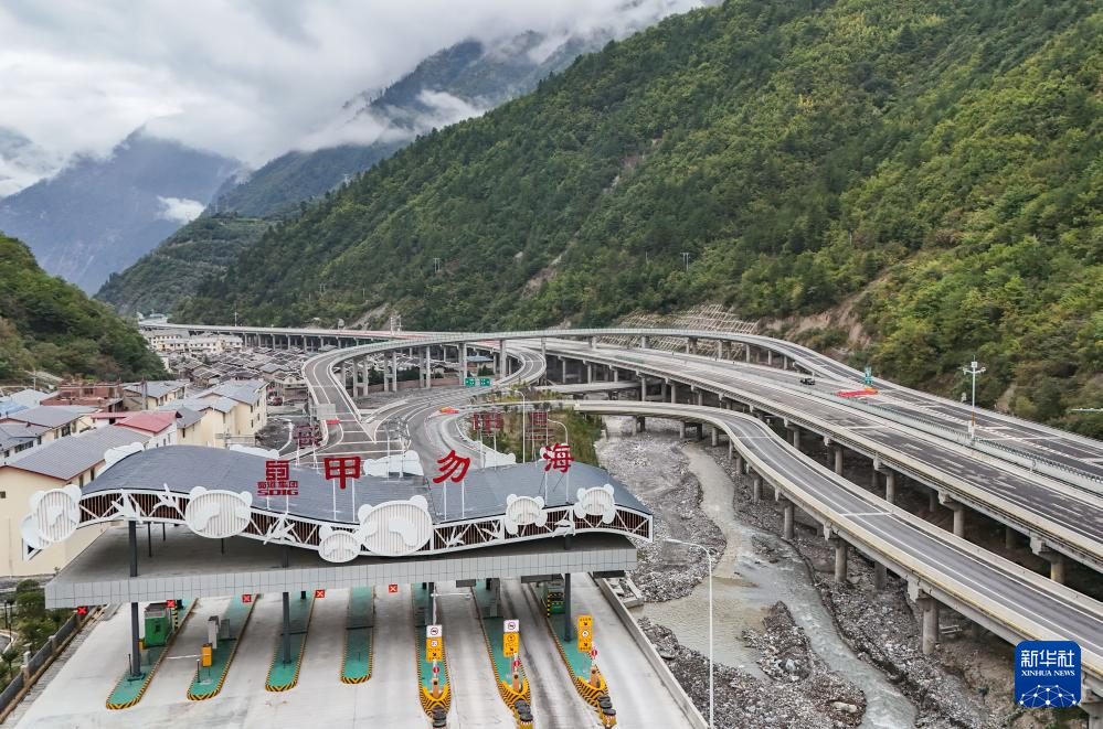 這是10月11日拍攝的正在建設中的九寨溝—綿陽高速公路甲勿海收費站(無人機照片)。九綿高速開通后,從成都至九寨溝縣的時間將從原來的8小時縮短至4小時。新華社記者 王曦 攝