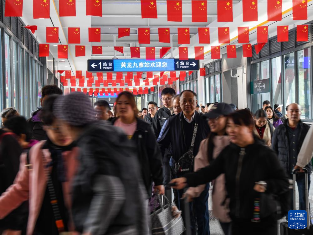 10月9日,游客到達川青鐵路黃龍九寨站。新華社記者 王曦 攝