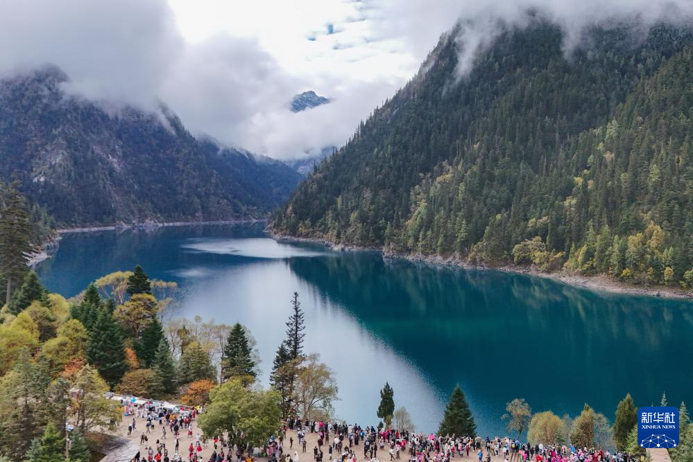 10月10日,游客在九寨溝景區(qū)長海游覽觀光(無人機照片)。新華社記者 王曦 攝