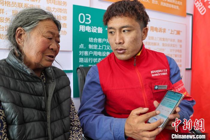 10月17日,在青海省海北藏族自治州剛察縣果洛藏貢麻村,久邁多杰指導(dǎo)牧民用手機(jī)辦理用電業(yè)務(wù)。中新社記者 薛蒂 攝