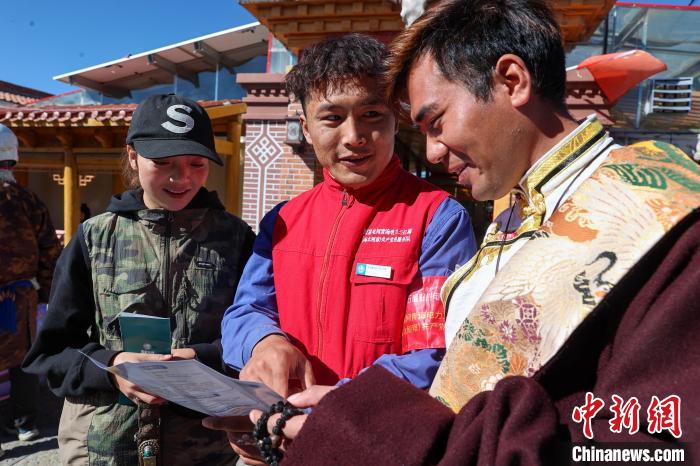 10月17日,在青海省海北藏族自治州剛察縣果洛藏貢麻村,久邁多杰為牧民介紹電力宣傳手冊(cè)。中新社記者 薛蒂 攝