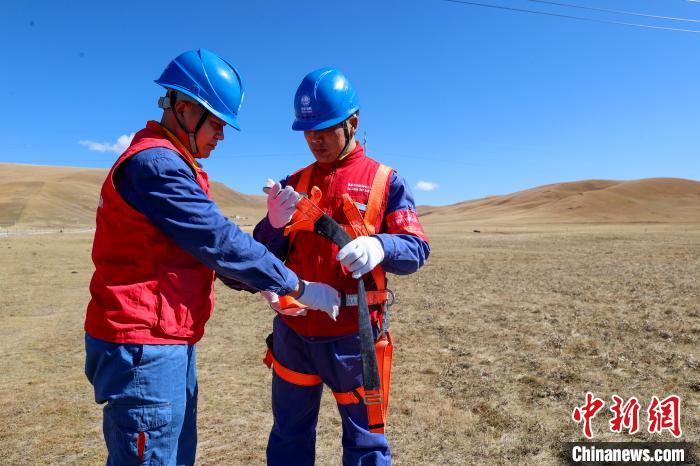 10月17日,在青海省海北藏族自治州剛察縣果洛藏貢麻村,同事為久邁多杰檢查安全防護(hù)裝備。中新社記者 薛蒂 攝