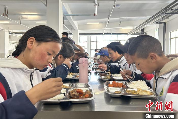 近日,色達縣中學東校區(qū),學生們在食堂用餐。中新社記者 王鵬 攝