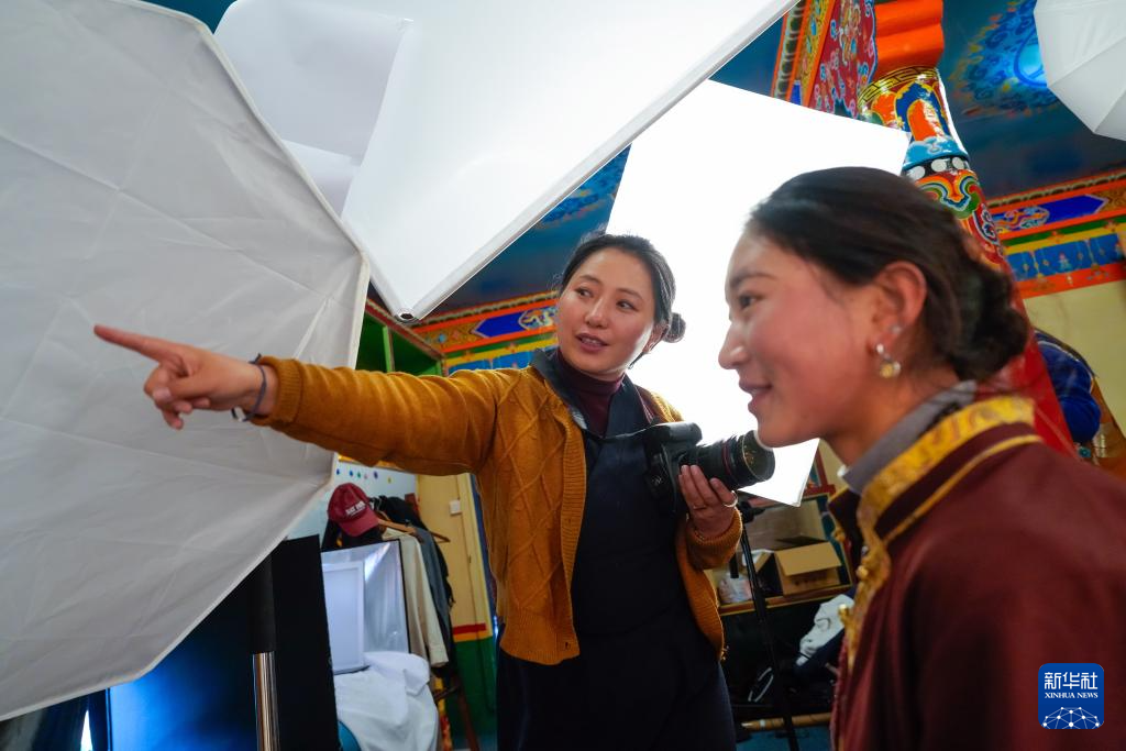 在“欽樂(lè)工坊”的攝影棚,達(dá)瓦卓瑪(左)指導(dǎo)模特如何擺姿勢(shì)拍攝品牌耳釘飾品(11月4日攝)。新華社記者 沈伯韓 攝