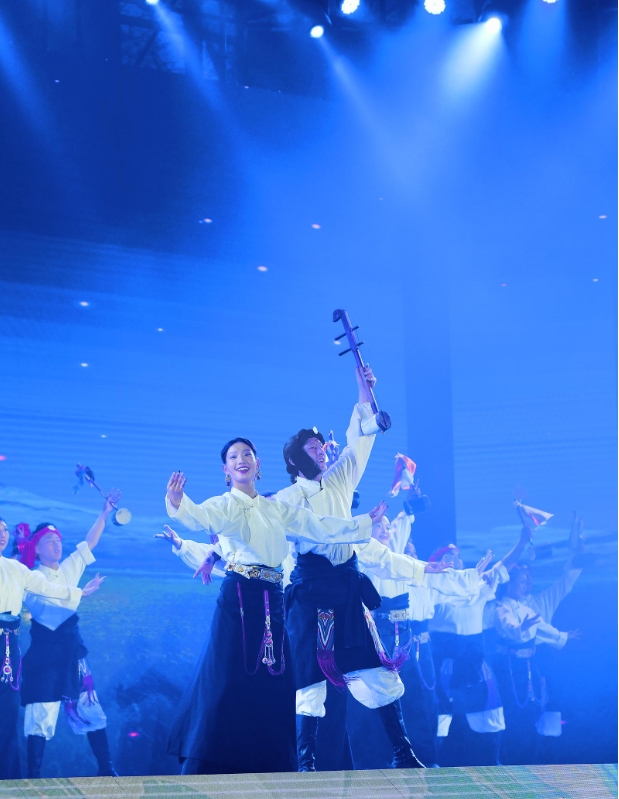 玉樹擁有豐富多樣的非物質(zhì)文化遺產(chǎn),于2017年設(shè)立了國家級(jí)藏族文化(玉樹)生態(tài)保護(hù)實(shí)驗(yàn)區(qū),這一舉措不僅強(qiáng)化了對(duì)藏族文化的保護(hù),也促進(jìn)了當(dāng)?shù)匚幕膫鞒信c發(fā)展。此次展演由開篇、第一章生命之源、第二章文化之魂、第三章五彩的三江源、尾聲五個(gè)部分組成,玉樹州民族歌舞團(tuán)精心挑選了玉樹伊舞、熱巴舞、藏族民歌等具有玉樹代表性的13個(gè)節(jié)目進(jìn)行了展示。