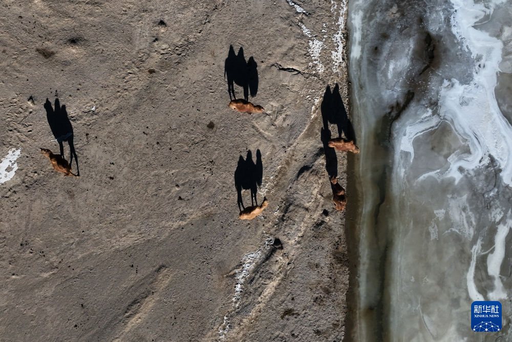 11月27日,在青海省海西蒙古族藏族自治州烏蘭縣,幾只駱駝正在休憩(無人機照片)。新華社記者 張龍 攝