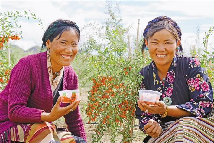 圖為當(dāng)?shù)厝罕娬谡故驹谌湛t市白朗縣嘎東鎮(zhèn)枸杞產(chǎn)業(yè)園區(qū)配套水保綜合項(xiàng)目?jī)?nèi)收獲的枸杞。