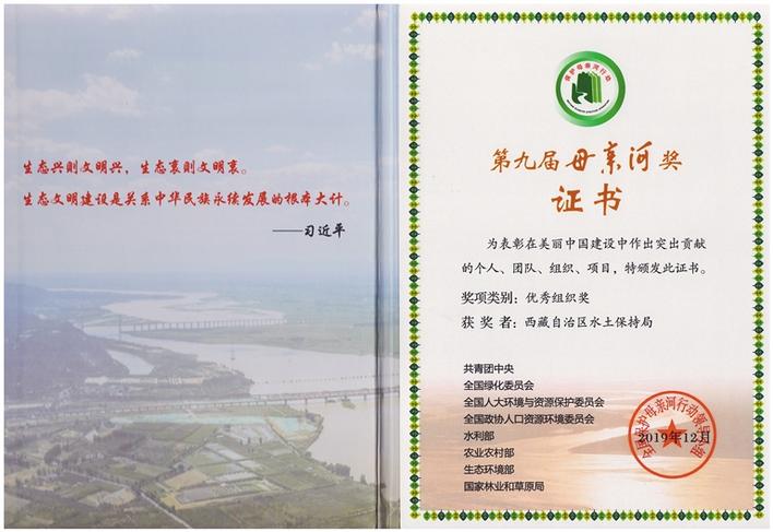 圖為西藏自治區(qū)水土保持局獲得“第九屆母親河優(yōu)秀組織獎(jiǎng)”獲獎(jiǎng)證書(shū)。