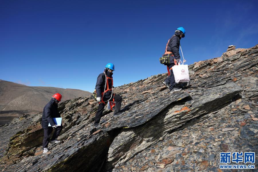 在西藏山南市洛扎縣,國家電網(wǎng)山南供電公司輸電運(yùn)檢中心員工龔朝偉(右)和國家電網(wǎng)安徽省電力有限公司援藏工作人員徐四勤(中)、吳寅(左)向浪洛線197號鐵塔前進(jìn)(2020年11月4日攝)。新華社記者詹彥 攝