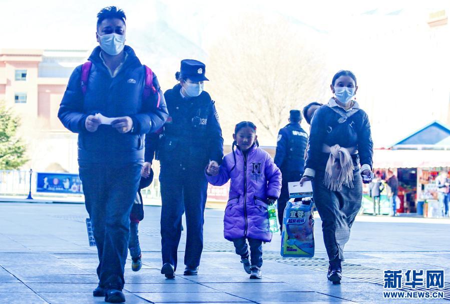 1月10日,“女子格?;ā本M民警在拉薩火車站帶領(lǐng)小旅客出站。新華社發(fā)(胡安鵬、黃飛攝影報(bào)道)