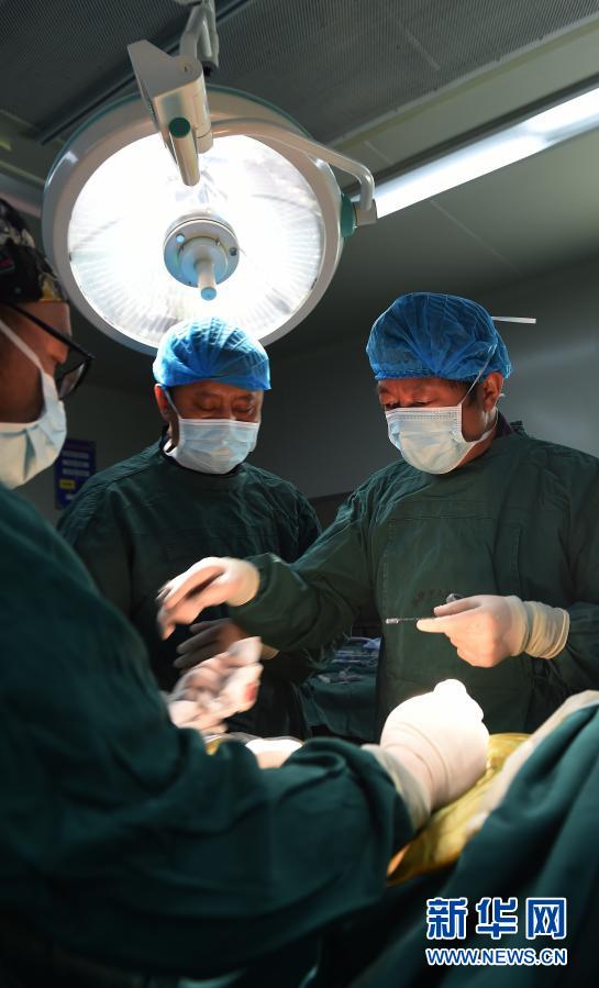 2017年5月26日,援藏醫(yī)生李家謀(右)帶領(lǐng)拉薩市人民醫(yī)院的藏族醫(yī)生進(jìn)行微創(chuàng)脊柱手術(shù)。新華社記者 覺果 攝