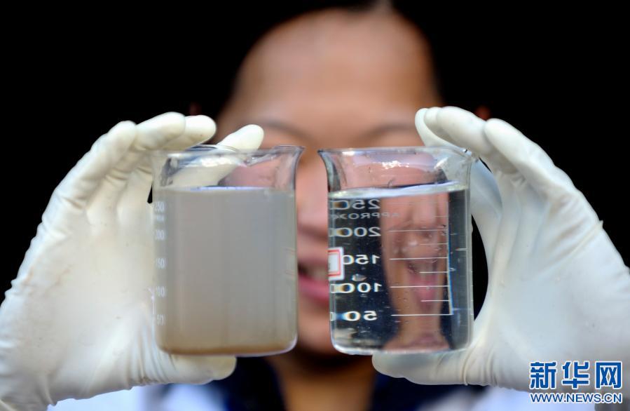 在西藏昌都污水處理廠,一名工作人員在展示污水處理結(jié)果(2010年10月6日攝)。新華社記者 普布扎西 攝