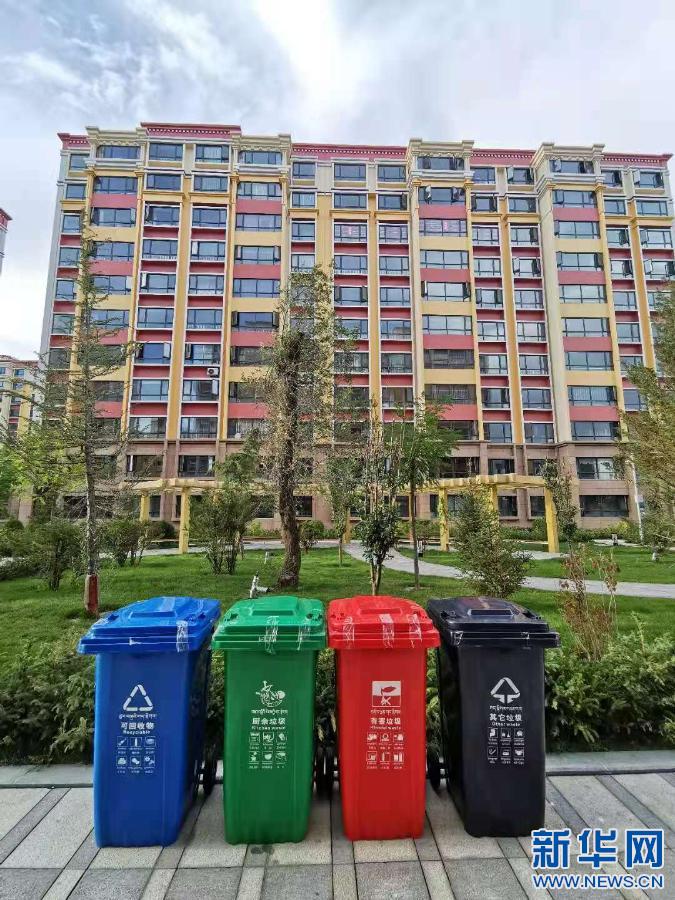 拉薩一新建成小區(qū)內(nèi)擺放的垃圾分類回收桶(2020年9月6日攝)。新華社記者 普布扎西 攝