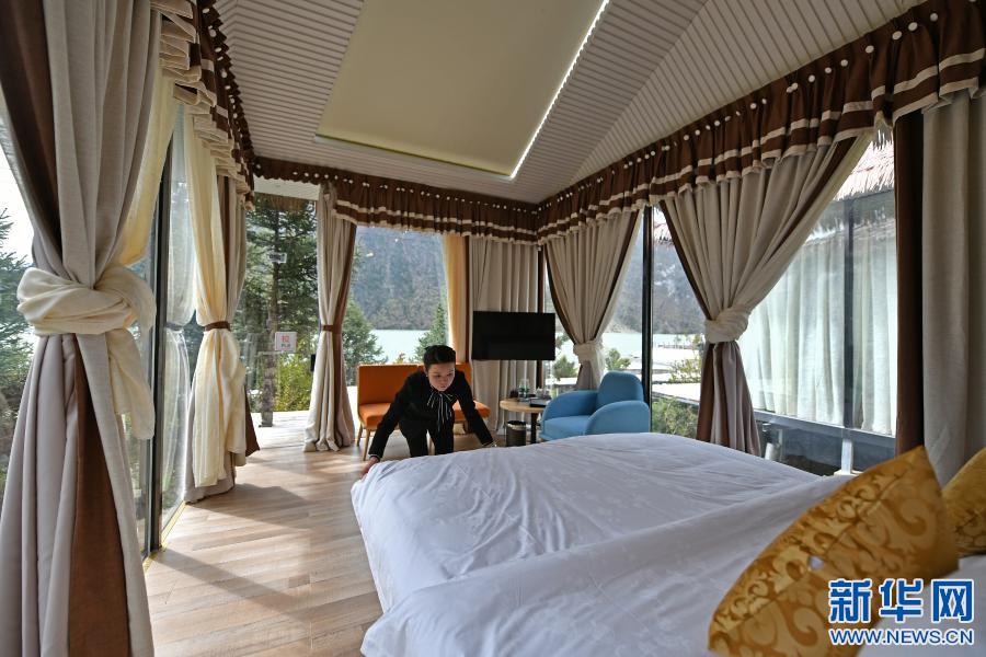 然烏國際自駕·房車露營營地是西藏昌都市八宿縣招商引資的旅游產(chǎn)業(yè)扶貧項目,2018年3月正式營業(yè)。圖為一名營地工作人員在湖邊的星空房內(nèi)整理房間(2019年5月24日攝)。新華社記者 李鑫 攝
