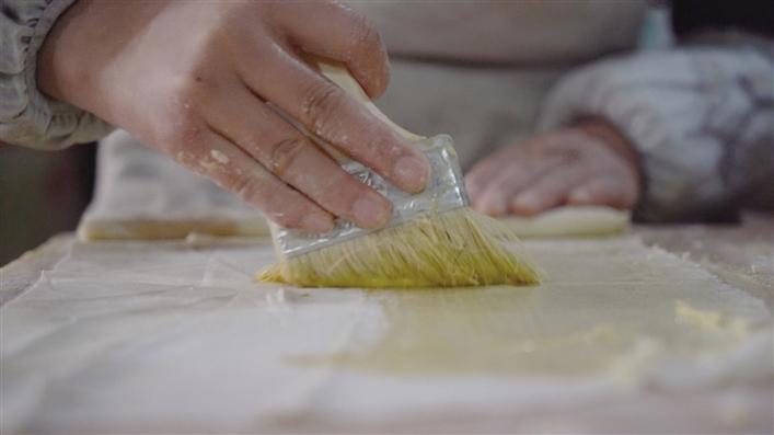 尼珍店內(nèi)共有7種類型的卡塞與布魯,她每天要工作到晚上9點半?!?月初,我們就開始制作售賣卡塞,今年生意還不錯,店員大部分是放假的大學生,每年這個時候,他們都會來店里工作?!蹦嵴湫Φ馈?/p>