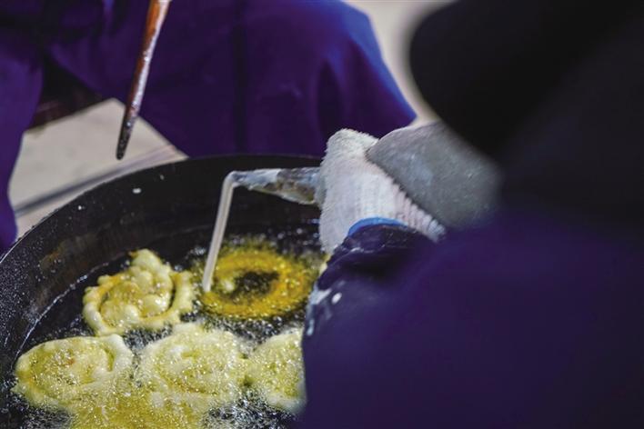 揉面、切割、染色,面片經(jīng)店員們巧手捏成條形、圓形、蝴蝶形等不同樣式,最后放到鍋里炸至金黃;出鍋時,再瀝上油、撒上白糖,香甜可口、樣式精美的卡塞就制作完成了。