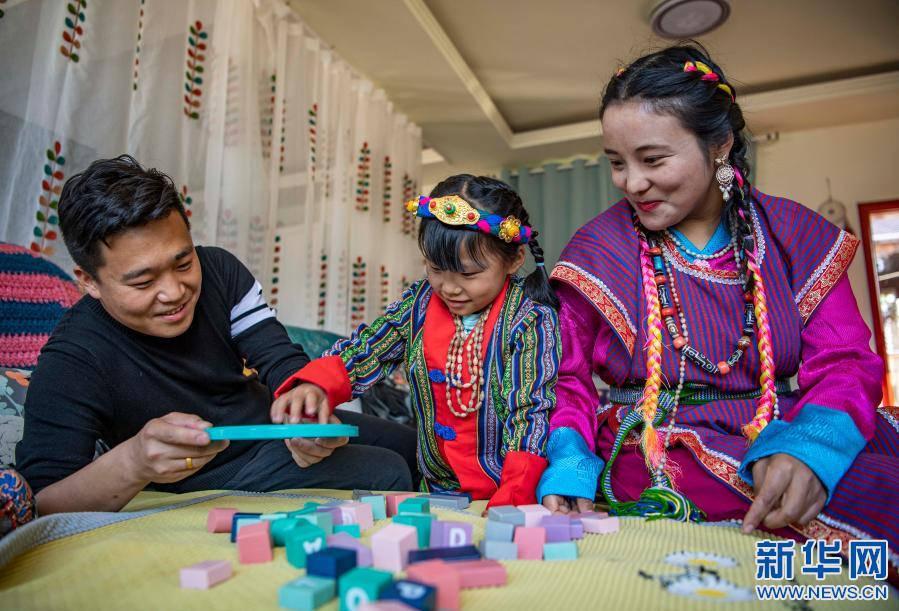 在位于西藏林芝市墨脫縣的家中,張淳煥和妻子扎西玉珍陪女兒玩積木(2月11日攝)。新華社記者 孫非 攝